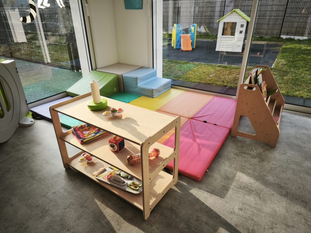 Le coin bébé stimule leur motricité vers la position assise puis debout à l’aide d’un miroir avec une barre d’appui notamment.