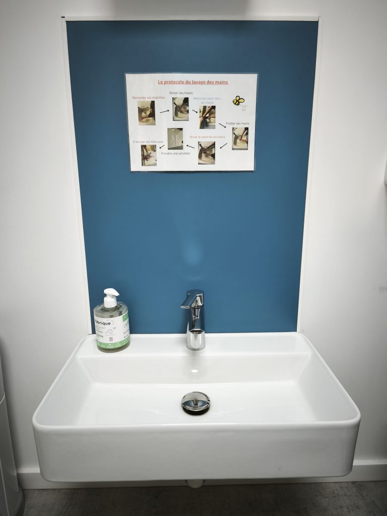 Un lave main à hauteur d’enfant est disponible pour le lavage des mains régulier dans la journée.