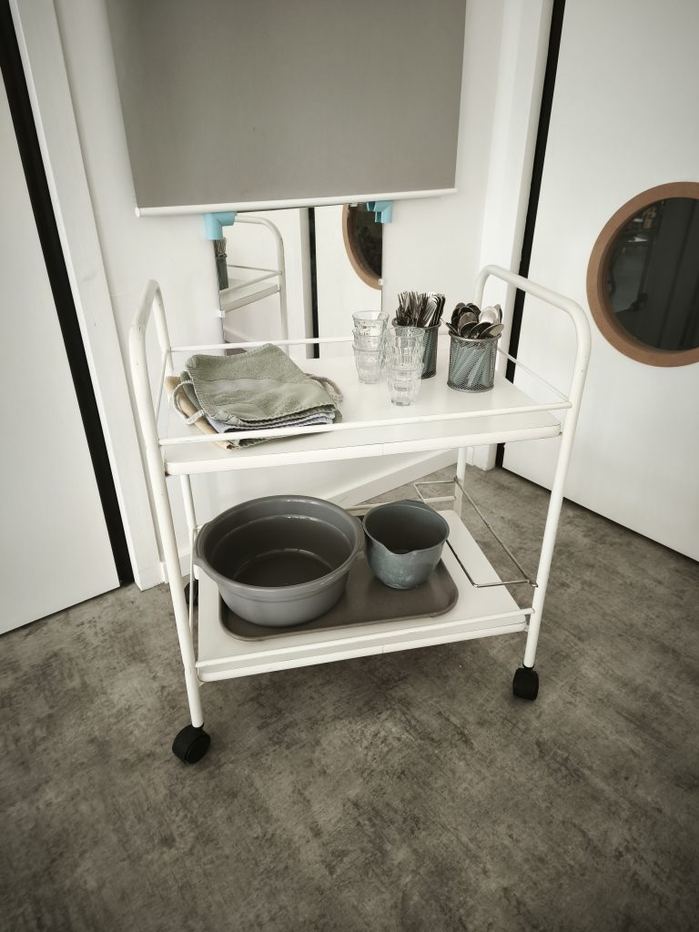 Les enfants participent dès qu’ils le peuvent à mettre sur la table les couverts et les verres à disposition sur un chariot à leur hauteur.