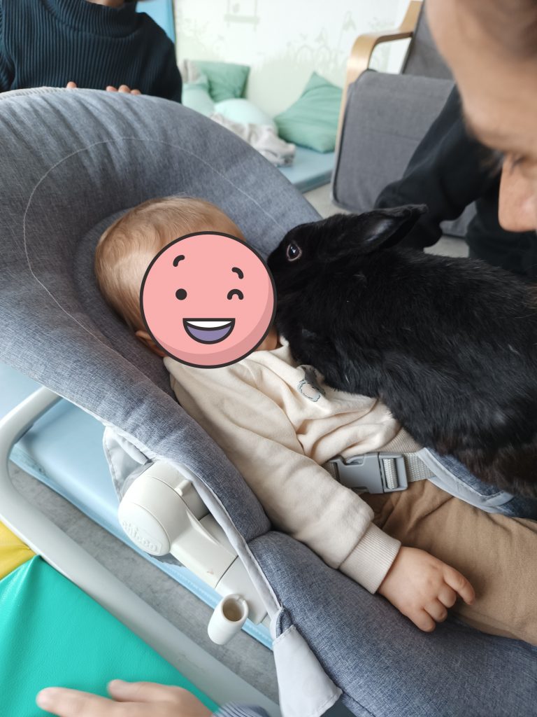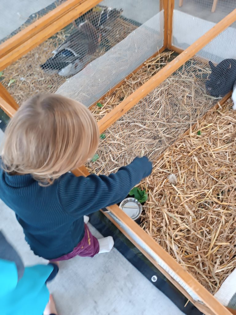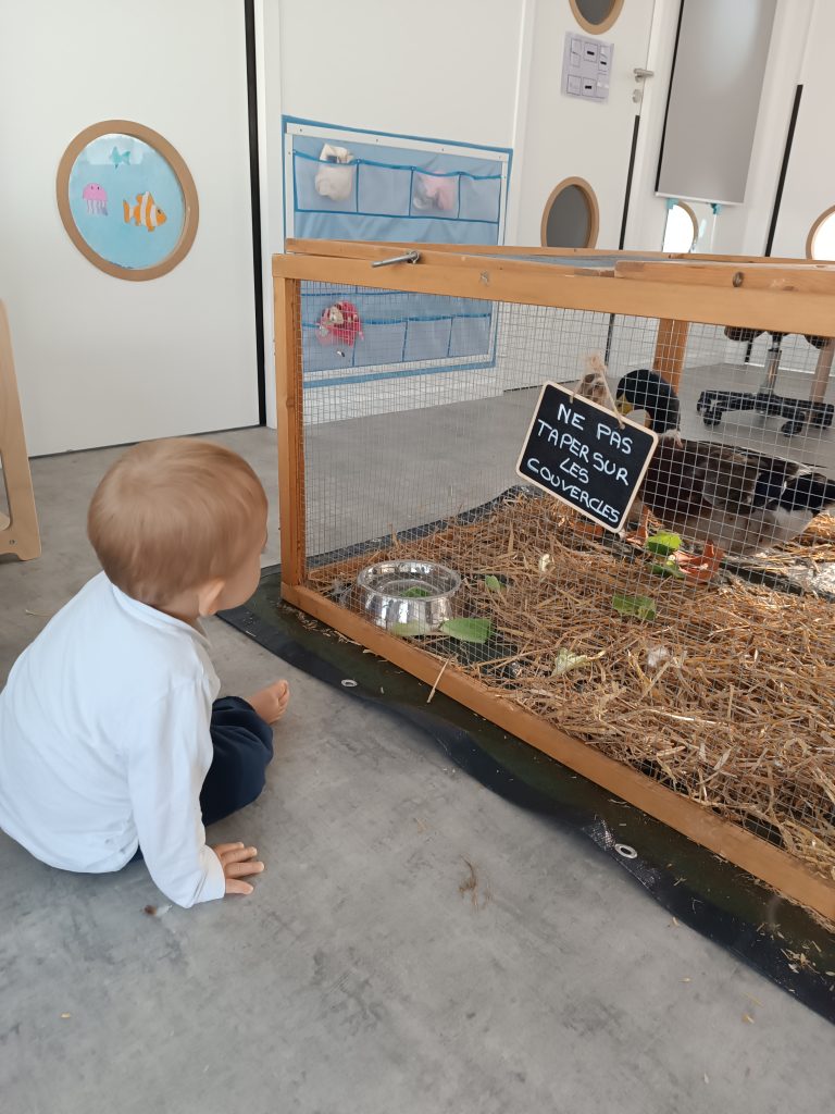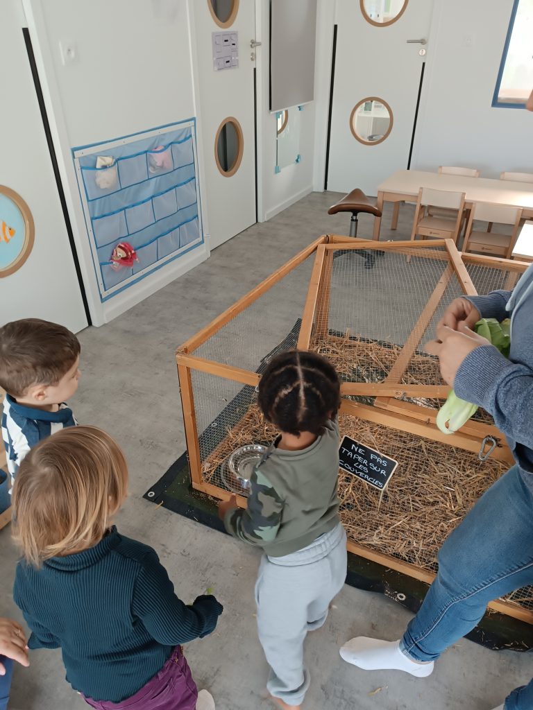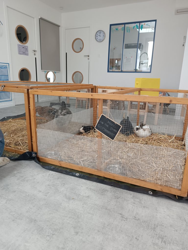 Deux fois par an, une ferme pédagogique est accueillie au sein de la crèche avec plusieurs animaux : poules, lapins, canard, cochon d’inde.